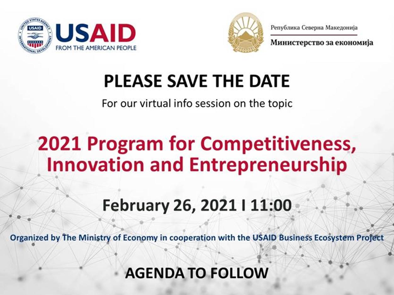Министерство за економија на РСМ и Проектот на УСАИД за развој на деловниот екосистем, организираат инфо средба со цел презентирање на програмата за конкурентност, иновации и претприемништво за 2021 година.